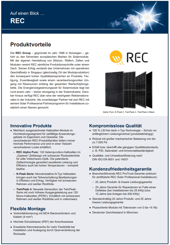 REC Solar ist ein renommierter Hersteller von hochwertigen Solarmodulen, die sich durch ihre hohe Effizienz und Leistung auszeichnen. Mit einer langjährigen Erfahrung und modernster Technologie liefert REC Solar zuverlässige Lösungen für die saubere Energieerzeugung.