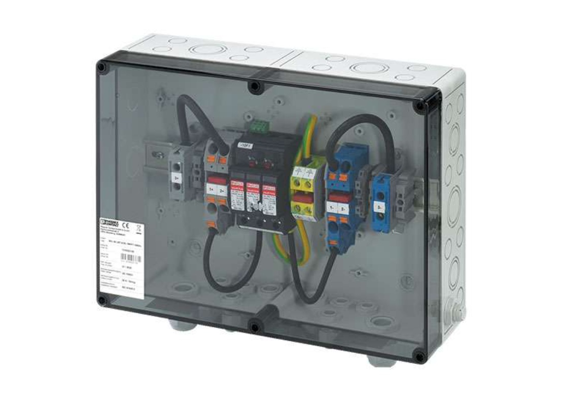 PV-Sets als Generatoranschlusskasten mit Kabelverschraubungen zur String Verdrahtung für 3 Eingangsstrings und 1 DC Abgang für Aluminiumleiter bis 50mm². Überspannungsschutz Typ 1/2 eingebaut.