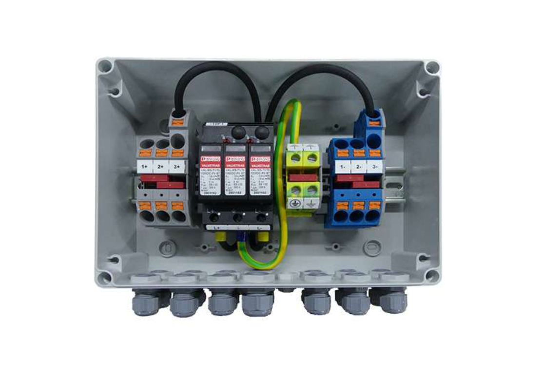 Generatoranschlusskasten für Photovoltaikanlagen bis 1000 V DC zum Anschluss von 1x 3 Strings. Mit Überspannungsschutz Typ I+II und Kabelverschraubungen für die Eingangs- und Ausgangsseite.