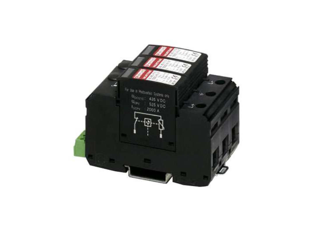 Überspannungsableiter für 2-polige isolierte Gleichspannungssysteme 1000 V DC, für Tragschienenmontage, 3-poliges Basiselement mit Fernmeldekontakt, drei steckbare temperaturüberwachte Schutzelemente, Statusmeldung an jedem Stecker.